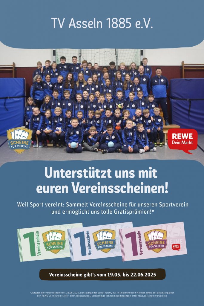 Die beliebte Aktion „Scheine für Vereine“ von REWE ist zurück – und der TV Asseln 1885 e.V. ist natürlich wieder mit dabei! Vom 19. Mai bis zum 22. Juni 2025 habt ihr die Möglichkeit, mit eurem Einkauf etwas Gutes für unseren Verein zu tun.